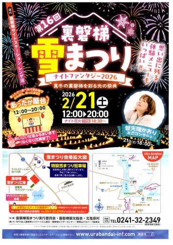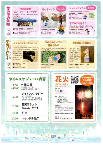 例年通り、裏磐梯サイトステーションを会場に、体験プランやナイトファンタジー、冬の花火等が行われます。